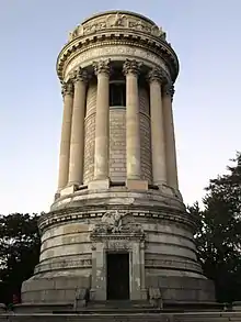 The white marble monument was designed after a public competition won by architects Charles and Arthur Stoughton. Their design was known as the "Temple of Fame".[2] The ornamental features were carved by Paul E. M. Duboy (1857–1907), who also was the architect of The Ansonia, an apartment building also on the Upper West Side. Inspired by Greek antiquity, the monument is based on the Choragic Monument of Lysicrates in Athens.[7] The monument takes the form of a peripteral Corinthian temple raised on a high base, with a tall cylindrical rusticated cella, that carries a low conical roof like a lid, ringed by twelve Corinthian columns.[8] Plinths at the entrance to the raised terrace are incised with the names of the New York volunteer regiments and the battles in which they served, as well as Union generals.