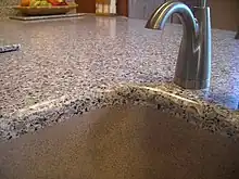 Solid surface is a non-porous low-maintenance material used for surfaces such as countertops. It can mimic the appearance of granite, marble, stone, and other naturally occurring materials, and can be joined nearly invisibly by a trained craftsman. Typically manufactured in sheet form for fabrication into finished countertops, solid surface can also be cast into a variety of shapes, including sinks, shower pans and bathtubs. Sheet goods can also be heated and bent into three-dimensional shapes using a process called thermoforming, which adds to the versatility of the product. Color and design flexibility are key factors when choosing engineered composites over natural stone.