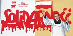 Solidarity (Polish: „Solidarność”, pronounced [sɔliˈdarnɔɕt͡ɕ] ⓘ), full name Independent Self-Governing Trade Union "Solidarity"[4] (Niezależny Samorządny Związek Zawodowy „Solidarność”, abbreviated NSZZ „Solidarność” [ɲɛzaˈlɛʐnɨ samɔˈʐɔndnɨ ˈzvjɔ̃zɛɡ‿zavɔˈdɔvɨ sɔliˈdarnɔɕt͡ɕ]), is a Polish trade union founded in August 1980 at the Lenin Shipyard in Gdańsk, Poland.[1] Subsequently, it was the first independent trade union in a Warsaw Pact country to be recognised by the state.[5] The union's membership peaked at 10 million in September 1981,[2][3] representing one-third of the country's working-age population.[6] Solidarity's leader Lech Wałęsa was awarded the Nobel Peace Prize in 1983 and the union is widely recognised as having played a central role in the end of Communist rule in Poland.