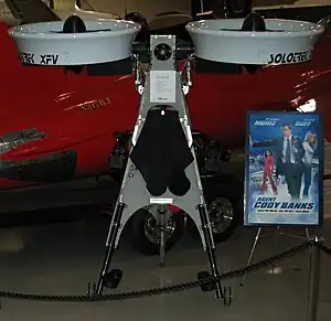 The SoloTrek XFV (Exo-skeletal Flying Vehicle) was a single-person VTOL aircraft. It was first flown in December 2001 by Millennium Jet Inc, a private company run by Michael Moshier. Millennium Jet subsequently changed its name to Trek Aerospace Inc. The SoloTrek pilot maintained a standing position and was propelled by two ducted fans located above and on either side of the user, leading some to class it as a type of backpack helicopter. It ran for around 2 hours on gasoline fuel. According to Michael Moshier, its inventor and designer, SoloTrek was capable of hovering for up to two hours, flying at 100 km/h and travelling more than 200 km.[1]