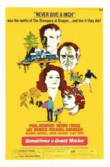 Sometimes a Great Notion (also known as Never Give A Inch) is a 1971 American drama film directed by Paul Newman and starring Newman, Henry Fonda, Michael Sarrazin, and Lee Remick. The cast also includes Richard Jaeckel in an Academy Award-nominated performance.