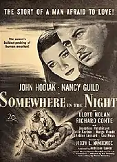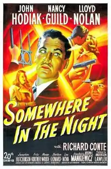 Somewhere in the Night is a 1946 American film noir psychological thriller film directed by Joseph L. Mankiewicz, written by Mankiewicz with Howard Dimsdale and Lee Strasberg from a short story by Marvin Borowsky, and starring John Hodiak, Nancy Guild, Lloyd Nolan and Richard Conte.