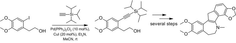 An example of the coupling of an aryl iodide to an aryl acetylene can be seen in the reaction of an iodinated alcohol and tris(isopropyl)silylacetylene, which gave an alkyne, an intermediate in the total synthesis of the benzindenoazepine alkaloid bulgaramine.[49]