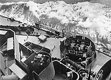 South Dakota was built as a fleet flagship, with an extra deck on her conning tower for extra command space, so her secondary battery had sixteen 5-inch (127 mm)/38 caliber Mark 12 guns in eight Mark 28 Mod 0 twin dual-purpose (DP) mounts, four on either side of the superstructure. This was two turrets fewer than her sister ships who had ten twin DP mounts of twenty guns, five on either side of the ship.[18] These turrets weighed 156,295 lb (70,894 kg) and could depress their guns to −15 degrees and elevate them to 85 degrees. The guns fired a variety of different projectiles, including anti-aircraft (AA), illumination, and white phosphorus (WP) shells, at a rate of fire of 15–22 rounds per minute. The AA shells were 20.75 in long (52.7 cm) and weighed between 54 and 55 lb (24–25 kg), depending on the variant. The illumination and white phosphorus shells were slightly smaller, at 20 in (51 cm) long; the illumination rounds weighed 54.4 lb (24.7 kg) and the WP shells were 53 lb (24 kg).[19]