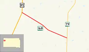 South Dakota Highway 168 (SD 168) is a state highway in Butte County in the U.S. state of South Dakota. It runs from U.S. Highway 85 (US 85) to SD 79. The highway is maintained by the South Dakota Department of Transportation (SDDOT), and is not part of the National Highway System.