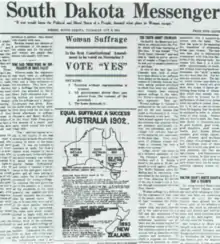 The South Dakota Messenger was a weekly feminist newspaper in South Dakota, United States, from January 1912 to October 1914.[1][2] It was published in Pierre, South Dakota, by Wm. J. Mundt.[1] Marguerite Karcher-Sahr, the daughter of Pierre pioneer Henry Karcher, wrote for the newspaper.[3] Ruth B. Hipple was one of the editors.[2]