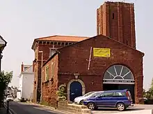 The most familiar engine house, and the most intact one which actually saw service, is situated on the landward side of the line at the south end of Starcross railway station. The chimney, reduced in height for safety many years ago, had for a while a new pitched roof, but it has since been removed. Unlike the other engine houses this one is built of Heavitree stone from Exeter, a coarse red sandstone that has not weathered well. The accompanying photograph from 2007 shows the original wall along the narrow street called The Strand, but within the next decade it had to be rebuilt with a concrete surface painted to resemble stones.[8]
