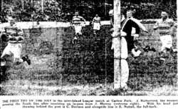 During the match R Haslam was running with the ball when he began falling into a hole which had fallen into the ground. In the meantime he had passed the ball and play moved away but was forced to stop once the referee realised what had happened. It had formed near a drain where the water had washed away the soil beneath the ground. A ball boy was photographed standing in the hole ‘buried’ to his waist.[19] The gate receipts for the match were £608 19/ with 15,000 in attendance at the match and the trial curtain-raiser.
