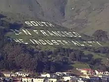 The city is particularly noted for the South San Francisco hillside sign on Sign Hill, which rises to the north of the city, with large white letters that proclaim "South San Francisco, The Industrial City". The sign, a tribute to the city's industrial past, is listed on the National Register of Historic Places.[12]