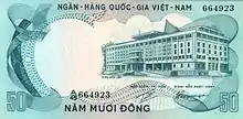 In 1953, notes (dated 1952) were introduced by the Institut d'Emission des Etats du Cambodge, du Laos et du Vietnam in denominations of 1, 5, 10, 100 and 200 đồng. On 22 September 1955, the Ministry of Finance and Economic Affairs announced that notes from the Bank of Indochina and the Institut d’Emission issues for Cambodia and Laos would be exchanged for Institut d’Emission issues for Vietnam starting 30 September until 7 November. The Institut issues for Cambodia and Laos ceased to be legal tender on 7 October, and all Bank of Indochina notes lost their legal tender status on 31 October following the 15 October introduction of the first notes from the National Bank of Vietnam.[3] Subsequently, the Ngân-Hàng Quốc-Gia Việt-Nam (National Bank of Vietnam) took over the issuance of paper money, introducing 2 and 500 đồng notes in 1955 and 20 and 50 đồng in 1956. Between 1964 and 1968, notes below 50 đồng were replaced by coins. In 1971, 1000 đồng notes were introduced. Due to steady inflation, 5000 and 10000 đồng notes were printed in 1975 but not issued due to the fall of Saigon.