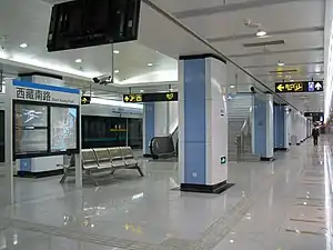 South Xizang Road (Chinese: 西藏南路; pinyin: Xīzàng Nán Lù) is the name of an interchange station between Line 4 and Line 8 of the Shanghai Metro.[1] It began operation on both lines on 29 December 2007.[2][3] On 22 October 2010 the station handled about 100,000 entries and exits.[4] It is the first station in Huangpu District when travelling northbound on Line 8.