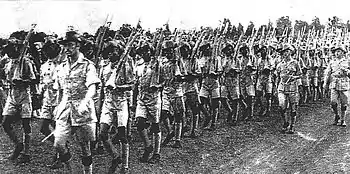 The British had expected Fascist Italy—with its African possessions—to join the war on Germany's side as soon as it began, but fortunately for the Allies this did not immediately occur.[16] No. 1 Squadron SRAF was already in northern Kenya, having been posted to the Italian East African frontier at Britain's request in late August.[17] The first Southern Rhodesian ground forces to be deployed abroad during World War II were 50 Territorial troops under Captain T G Standing, who were posted to Nyasaland in September at the request of the colonial authorities there to guard against a possible uprising by German expatriates. They returned home after a month, having seen little action.[18] White Rhodesian officers and non-commissioned officers left the colony in September and October 1939 to command units of black Africans in the west and east of the continent, with most joining the Royal West African Frontier Force (RWAFF) in the Colony of Nigeria, the Gold Coast and neighbouring colonies.[18] The deployment of white Rhodesian officers and NCOs to command black troops from elsewhere in Africa met with favour from the military leadership and became very prevalent.[19]