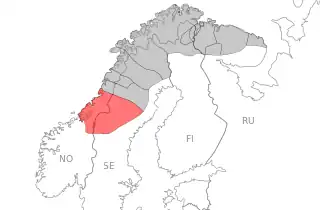 ![]() Southern Sami language area (red) within Sápmi (grey) | |