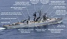 For her air defense role, she was equipped with two double ZIF-101 launchers with sixteen 4K90 missiles each for the M-1 Volna surface-to-air missile system (NATO reporting name SA-N-1 Goa), a navalised version of the S-125 Neva. Two double AK-726 76.2 mm guns protected against both aerial and surface threats. She was also equipped with two 12-barrel RBU-6000 and two 6-barrel RBU-1000 anti-submarine rocket launchers, and a quintuple mounting for 533-millimeter (21.0 in) dual-role torpedoes.[3][4] The Ka-25 helicopter that could be landed on the destroyer was also capable of aiding in the search and destruction of submarines.[5]