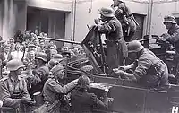 With memories of the mass deportations of a week before still fresh, the German troops were widely greeted at their arrival by the Latvians as liberators. The Latvian national anthem played on the radio, and, as Chris Bellamy wrote: "the [anti-Soviet] rebellion broke out immediately after the news of Barbarossa".[47] The majority of ethnic Latvians who had been forced to serve in the Red Army deserted from their units, and soon afterwards attacked the NKVD. On July 2, 1941, a unit of Latvian deserters captured the town of Sigulda, and three days later, Latvian rebels took control over another town, Smiltene, also blocking the strategic road to Pskov. Latvians did not only desert en masse from regular Red Army units, they also escaped from military training camps, which were part of the Soviet mobilization plan. Among other battles with retreating Soviet units, Bellamy mentions Limbaži (July 4), Olaine (July 5), and Alūksne (July 9). All these locations were captured by Latvian rebels before the first Wehrmacht units appeared in the area.[47]