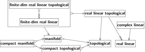 Both transitions are not surjective, that is, not every B-space results from some A-space. First, a 3-dim Euclidean space is a special (not general) case of a Euclidean space. Second, a topology of a Euclidean space is a special case of topology (for instance, it must be non-compact, and connected, etc). We denote surjective transitions by a two-headed arrow, "↠" rather than "→". See for example Fig. 4; there, the arrow from "real linear topological" to "real linear" is two-headed, since every real linear space admits some (at least one) topology compatible with its linear structure.