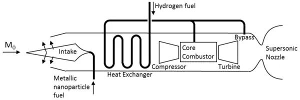 The DASS engine concept improves upon the heat exchange process in multiple ways. Surface nano-coatings[5] are placed on the internal heat exchangers to enhance convective heat transfer rates, reduce heat exchanger mass, and reduce unwanted aerodynamic blockage. Metallic nanoparticles are seeded into the intake air from the inlet cone to further enhance heat transfer. The particles act as a supplemental fuel and assist the operation of flow control devices downstream. It is known that metallic fuels have desirable storage properties in comparison to hydrogen and have excellent energy densities on a per volume basis.[6] A combination of hydrogen and nanoparticles of Boron are being considered as the engine's fuel.