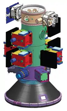 Included was COSMIC-2, a cluster of six satellites, with a mass of 277.8 kg (612 lb) each.[13] The primary role of the COSMIC-2 satellite constellation is to provide radio occultation data with an average latency of 45 minutes. The six satellites were placed on an orbit with an inclination of 24° to 28.5° with plans for them to move eventually to six separate orbital planes with 60° separation between them.[14] The payload stack was integrated using an ESPA ring. Two ESPA Grande rings were used to mount the six COSMIC-2 satellites beneath the upper payload adapter hosting the DSX payload and avionics modules.[15]