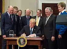 The 1958 National Aeronautics and Space Act, which created NASA, created a National Aeronautics and Space Council chaired by the President to help advise him, which included the Secretary of State, Secretary of Defense, NASA Administrator, Chairman of the Atomic Energy Commission, plus up to one member of the federal government, and up to three private individuals "eminent in science, engineering, technology, education, administration, or public affairs" appointed by the President.[4] Before taking office as president, John F. Kennedy persuaded Congress to amend the Act to allow him to set the precedent of delegating chairmanship of this council to his vice president (Lyndon B. Johnson). The council was discontinued in 1973 during the presidency of Richard M. Nixon. In 1989, President George H. W. Bush re-established a differently constituted National Space Council by executive order, which was discontinued in 1993 by President Bill Clinton. President Donald Trump reestablished the council by executive order in 2017.[5]