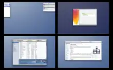 Spaces also works effectively with Exposé, another Mac OS X feature, where you can designate a "hot corner" to activate the full-screen feature of Spaces, showing a "zoomed-out" grid of scaled-down thumbnails for each space. Also, when the Spaces grid has been activated, Exposé may be additionally deployed to reveal the active windows or documents on each space.