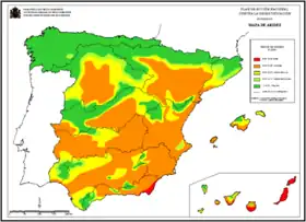 Mainland Spain has been characterised historically by relative inaccessibility from outside and by difficult communication between different parts of it. "[W]alls and battlements divide within itself the territory which walls and battlements separate from other countries".[2] In contrast to the "vast monotony" of the central plateau, the surrounding peripheral areas "present to the traveler every possible landscape".[3] Diversity in forms of agriculture and its productivity are conditioned by the contrasts in rainfall between "wet" and "dry" Spain, and to the extent that irrigation has been introduced.[4] In the past the peripheral regions benefited from cheap coastal transport, whereas transport costs and distance hindered the development of the central regions.[5]
