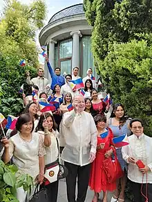 Members of the Filipino community in Spain, led by Ambassador Philippe Lhuillier, celebrating Independence Day at the Philippine Embassy in Madrid on June 12, 2022
