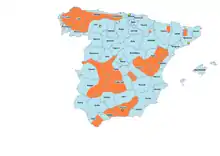 Among the areas of major maquis activity were the Cornisa Cantábrica, from Galicia to Cantabria, especially the mountains of Lugo, Asturias and the area north of León; the Iberian System, specifically the area between the provinces of Teruel, Castellón, Valencia, and Cuenca; Centro, which consists of Extremadura, the north of Cordova, Ciudad Real, Toledo and the mountains of the Sistema Central; and two independent areas in the south of Andalusia: Cádiz on one hand and Granada-Málaga on the other.[4] There was also activity in other areas, such as La Mancha and High Aragon.