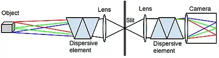 An advanced spatio-spectral scanning system, proposed in June 2014, consists of a dispersive element before a spatial scanning system. (This allows for easy switching between spatial and spatio-spectral scanning). The imaging process is based on spectral analysis of a strip of a dispersed image of the scene. The field of view in the wavelength-coded spatial dimension equals the dispersion angle of the dispersive element.[1] As in the more basic system, scanning is achieved by transverse movement of the slit or by moving the system relative to the scene.