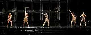 The group performing "Wannabe" during The Return of the Spice Girls Tour in Toronto in February 2008