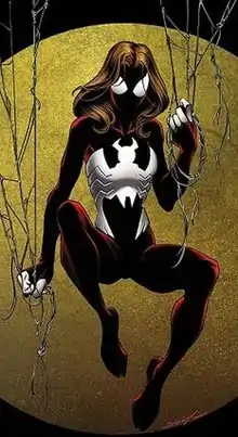 Spider-Woman later appears during the "Ultimatum" storyline, making their public debut when they help Johnny Storm apprehend the Vulture.[7] Storm begins to develop a romantic interest in Spider-Woman after a bad date with a famed but obnoxious teen singer, unaware that they are Spider-Man's female clone. They later meet May Parker while aiding civilians during Magneto's worldwide attack,[8] taking them to safety and promising to find Peter for them.[9] Later, she travel's to the center of Manhattan where Doctor Strange's home is being attacked by Nightmare; the Hulk begins to destroy the portal to the Dark Dimension, causing an explosion.[10] After briefly being chased by Hulk, Spider-Woman continues her search for Peter and meets Kitty Pryde. They work together on the search as well as try to help survivors, but are overwhelmed by the deaths and destruction around them. They manage to find a remnant of Peter's mask, which Kitty takes with her and gives to Mary Jane Watson at Peter's home, informing her and May that Peter is still among the missing.[11]