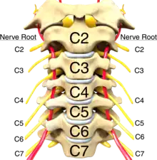 Since tetraplegia is defined as dysfunction in the cervical spinal cord, this section will focus on the anatomy of the cervical spinal cord. To understand how tetraplegia presents after injury, it is imperative to have a broad knowledge of the cervical spinal roots and its many functions. In the cervical spine, nerve roots exit the spine above the associated vertebra (i.e. the C6 nerve root exits above the C6 vertebra). By evaluating what nerve root of the cervical spine is injured, the affected muscle groups and dermatomes can be determined. This informs the evaluator as to what activities may be limited as a result of the injury. This is typically done at 72 hours post-injury; exams done prior to this time have been found to be inaccurate due to the presence of swelling and other confounding factors.[7] For example, an injury at the C6 nerve root level will affect the function of the triceps (elbow extension) but the biceps (elbow flexion) will be spared; in this case, an injury at the C6 root level affects all function at that level and below whereas the C5 nerve root, which controls the biceps, is spared since it is above the C6 level in the spinal column. When classifying an individual's level of function, there are numerous functional assessment tools that may be used in a clinical setting and it is often up to the clinician's discretion as to which tools are used. A comprehensive list of these tools may be found on the ShirleyRyan AbilityLab website.