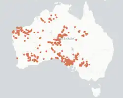 The spinifex slender blue-tongue species is predominantly found within sandy or rocky desert ecosystems that have an abundance of spinifex grasses.[4] The low bearing vegetation of spinifex and clumped grasses aids in providing a shelter for this species while also acting as camouflage from predators.[2] During the daytime, the C. melanops typically searches for shade under rocks and within the Spinifex grass.[5] Providing their adaptive behaviour to the harsh conditions of the desert. The habitat for C. melanops is not only characterised by the presence of Spinifex but also in the abundance of food. This species has a tendency to wait and foraging in open spaces between tussocks for prey. While also relying on spinifex clumps as an escape cover if needed.[3][5] In turn proving that the relationship between the Spinifex slender blue-tongue and spinifex grasses is important as it aids in the overall survival for this skink species.