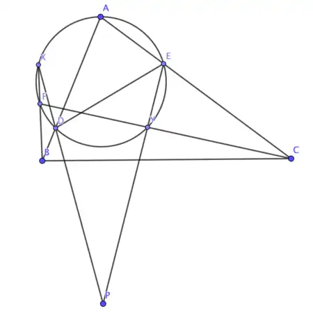 We now note that is the spiral center that maps to . Let be the intersection of and . By the spiral similarity construction above, the spiral center must be the intersection of the circumcircles of and . However, this point is , so thus points must be concyclic. Hence, must lie on , as desired.