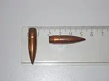 The spitzer bullet (or spire point) is a pointed projectile that is primarily used in small-arms. The pointed nose shape, which was developed for military purposes in the late 19th and early 20th century, was a major design improvement compared to earlier rounder or flatter-tipped bullets because pointed nose shapes were less susceptible to external ballistic factors like drag. By adding a point, projectiles made for fully-powered and intermediate rifle cartridges obtain a lower drag coefficient, which makes them decelerate less rapidly. Lowering the drag coefficient leads to improved external ballistic behaviour.[1]