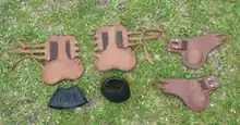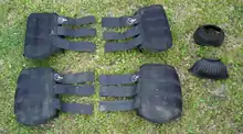 Modern brushing boots are usually made of synthetic materials such as Neoprene or traditional materials such as leather. They usually attach by a wide velcro fastening which is pulled around the leg, although they can also be pushed through a ring and be fastened back upon themselves, making them more secure and less likely to slip during exercise. They can have between 1 and 5 straps, with front leg boots usually having more straps. Some boots may have buckles, especially older designs. They have a protective padded area on the side of the boot which is on the inside of the horses leg, protecting the cannon bone and fetlock.