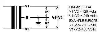 A transformer supplying a three-wire distribution system has a single-phase input (primary) winding. The output (secondary) winding is center-tapped and the center tap connected to a grounded neutral. As shown in Fig. 1, either end to center has half the voltage of end-to-end. Fig. 2 illustrates the phasor diagram of the output voltages for a split-phase transformer. Since the two phasors do not define a unique direction of rotation for a revolving magnetic field, a split single-phase is not a two-phase system.