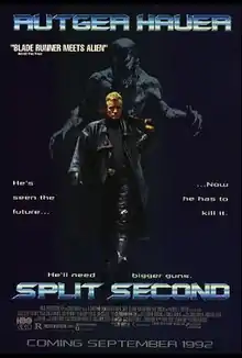 Split Second is a 1992 science fiction action horror film directed by Tony Maylam and Ian Sharp,[5] and written by Gary Scott Thompson. A co-production between the United States and the United Kingdom, the film stars Rutger Hauer as a burnt-out police detective obsessively hunting down the mysterious serial killer who killed his partner several years prior. The film also features Kim Cattrall, Alastair Neil Duncan, Pete Postlethwaite, Ian Dury, and Alun Armstrong.