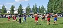 Several Indian variations of tag, such as kabaddi and kho-kho, originated in prehistoric times, with kho-kho being played as far back as the fourth century BCE.[32] Atya-patya, a variant of tag, was mentioned in the Naṟṟiṇai (written in 300 CE).[33][34][35] Kabaddi and atya-patya in particular were used for military training purposes.[35][36] During the rule of the Mughal Empire, pehlwani, a form of wrestling, was developed by combining native malla-yuddha with Persian varzesh-e bastani.[37]
