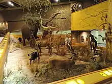 The African Hall features multiple taxidermied Savanna species, including a chimpanzee who lived at the Forest Park Zoo until 1967, and a giraffe, acquired in 1985, that died at a park in Oklahoma.[18]