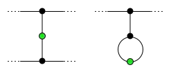 The diagram on the right shows a 2-spot game of normal-play Sprouts. After the fourth move, most of the spots are dead–they have three lines attached to them, so they cannot be used as endpoints for a new line. There are two spots (shown in green) that are still alive, having fewer than three lines attached. However, it is impossible to make another move, because a line from a live spot to itself would make four attachments, and a line from one live spot to the other would cross lines. Therefore, no fifth move is possible, and the first player loses. Live spots at the end of the game are called survivors and play a key role in the analysis of Sprouts.