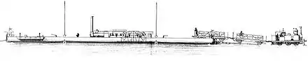 The ferry pontoons for carrying rail wagons were not able to navigate freely on the river, but instead were attached to two cables that were stretched across the river upstream of the ferry. Successful operation of the train ferry was only achieved when the original chains were replaced with stronger cables. The ferry was attached by a cable to another cable that ran over the river to resist the current and to serve as a guide rope. A thinner cable ran through the water on to two wheels on the ferry that were powered by a steam engine; the ferry hauled itself across the river by pulling on the cable.