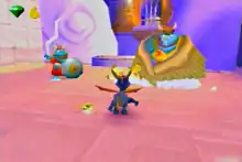 Year of the Dragon is a platforming video game primarily played from a third person perspective. The main objective is to recover stolen dragon eggs which are scattered across 37 levels.[1] These eggs are hidden, or are given as rewards for completing certain tasks and levels. The worlds of Spyro are linked together by "homeworlds" or "hubs", large worlds which contain gateways to many other levels. To proceed to the next hub, the character must complete five worlds, gather a certain number of eggs, and defeat a boss.[2]: 1–8 Players do not need to gather every egg to complete the main portion of the game or gain access to new levels; in fact, certain eggs can only be found by returning to the world at a later time. Gems are scattered across the worlds, hidden in crates and jars. These gems are used to bribe a bear named Moneybags to release captured characters and activate things which help Spyro progress through levels. Gems, along with the number of eggs collected, count to the total completion percentage of the game.[2]: 8 An atlas allows players to track their game completion and see remaining unfilled objectives.[3]