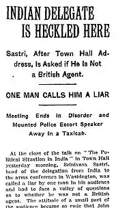 - ↑ "INDIAN DELEGATE IS HECKLED HERE; Sastri, After Town Hall Address, Is Asked if He Is Not a British Agent. ONE MAN CALLS HIM A LIAR Meeting Ends in Disorder and Mounted Police Escort Speaker Away In a Taxicab" (PDF). The New York Times. 29 January 1922.