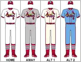 On November 16, 2012, the Cardinals unveiled a new alternate uniform to be worn at home games on Saturdays beginning with the 2013 season. The modified jersey, cream-colored with red trim on the sleeves and down the front, retains the "birds on the bat" but is the first since 1932 in which "St. Louis" is used instead of "Cardinals".[129] 2013 also saw the team adopt their red caps as their main cap for both home and away games for the first time since 1991; the navy cap was retained as an alternate, used when visiting other teams with red home caps.[128]