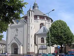 Stuyt then designed a domed church, which had an octagonal structure which supported a sixteen sided dome of reinforced concrete. One of the first such constructions in the Netherlands. It has a dwarf gallery on the outside. Two stair towers flank the western façade, in the center of which is a statue of St. Catharine.[4] The first stone was laid in 1916, and in 1918 the church was finished. The outside was renovated in 1995-1997.