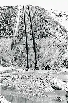 It was during the process of building the aqueduct that Mulholland first considered sections of San Francisquito Canyon as a potential dam site. He felt that there should be a reservoir of sufficient size to provide water for Los Angeles for an extended period in the event of a drought or if the aqueduct were damaged by an earthquake.[12] In particular, he favored the area between where the hydroelectric power plants Powerhouses No. 1 and No. 2 were to be built, with what he perceived as favorable topography, a natural narrowing of the canyon downstream of a wide, upstream platform which would allow the creation of a large reservoir area with a minimum possible dam.[13] A large camp had been set up to house the workers near this area, and Mulholland used his spare time becoming familiar with the area's geological features.