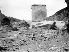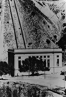 ![]() View of the dam looking north, with water in its reservoir, in February 1927 | |