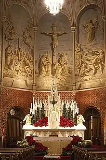 The murals of St. Francis Xavier Church have been called "the most significant examples of ecclesiastical art in West Virginia today" by the West Virginia Department of History and Culture. The murals are noteworthy because of their three-dimensional, bas-relief style also known as tromp l'oeil painting. The artist was Daniel Muller of Munich, Germany who came from New York City. Muller had painted other churches designed by Patrick Keely. Muller's most noted work before St. Francis Xavier was the Church of the Gesu in Montreal, Canada another Keely designed church. Today St. Francis Xavier parish has over 375 families and a parish population of over 1000 persons. St. Monica parish in nearby Lubeck, composed of 42 families, shares staff with St. Xavier. The parish supports two Catholic schools. Parkersburg Catholic Elementary School serves pre-school through grade 5. Parkersburg Catholic High School serves students in grades 6 through 12. Father John Rice is the current pastor of the parish.[6]