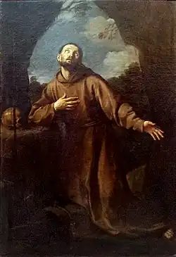 The art gallery of the Oratorians of Saint Philip Neri, known as the quadreria dei Girolamini, houses Reni's The Flight into Egypt and Jesus Meets John the Baptist. The famous clothing designer and rich textile merchant Domenico Lercaro left his whole art collection to the Oratorians in Naples (owners of the Girolamini) and a codicil to his will of 1622 states that Reni had already been paid at that date for three as-yet-undelivered works - one of John the Baptist, one of Saint Dominic and a third whose subject was not stated. A book of items leaving and joining the congregation between 1628 and 1633 mentions a Reni work arriving from his native Bologna.[3] All these pieces of evidence led us to presume that St. Francis was part of Lercaro's collection and that it was given to the Oratorians around 1630 and later placed in the chapel where it now hangs.