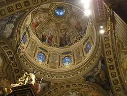 Something which one may not expect to see in a traditionally classic Baroque building, such as St George's, is a Byzantine style chapel. The cornerstone was laid in 2002. Today this chapel holds the Blessed Sacrament and the Holy Cross of the basilica. In 2004 work started on the building of the new dome of the chapel. The chapel was blessed by the then Archpriest Dr Joseph Farrugia on 10 July 2005.[6] This unusual style was chosen for its cultural association with the Christian Churches of the East. The aim was to help instil in the Catholic faithful the awareness that the universal Church breathes through two lungs, that of the Western Church as well as that of the Eastern-rite sui-iuris Catholic Churches in communion with Rome. The chapel and the dome were built to the designs of Vince Centorrino. The dome includes eight Byzantine style windows and is to be decorated with gold mosaic. The floor of the chapel is covered with porphyry slabs.[7] The chapel also includes a solid silver tabernacle, seven feet tall. It was built in the form of the ancient ciborium that was in use in St George's up to the sixteenth century when it was lost but retrieved again when it was found buried in the old façade of the basilica, some two centuries later.[8]